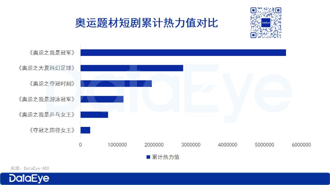 本周,共有6部奥运题材相关短剧登上DataEye短剧热力榜,其中四部均来自山海和咪呜,一部来自六翼,一部来自美光盛世,热力值总计超过1200W。TOP1短剧《奥运之我是冠军》热力值超550W。7月26日,闯入DataEye短剧热力榜TOP3。