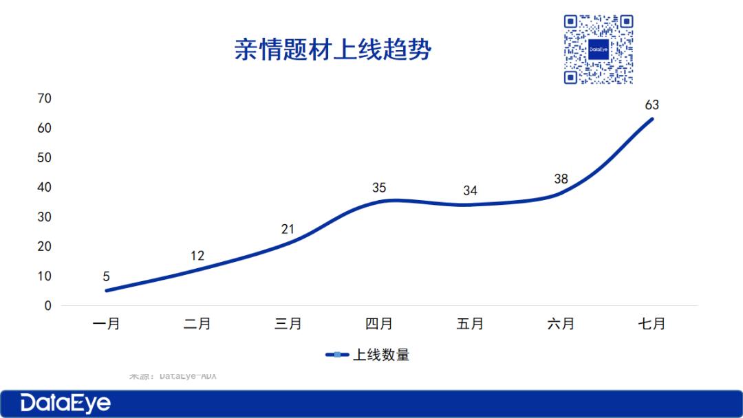 从近期的DataEye短剧热力榜来看,6月过后,亲情题材短剧热度不减反升。七月以来,共上线63部亲情题材短剧,相比五月和六月都有大幅上涨。未来3个月,还有中秋节、国庆节、重阳节等与亲情团圆息息相关的节日,相信亲情题材依旧会是大热门题材。