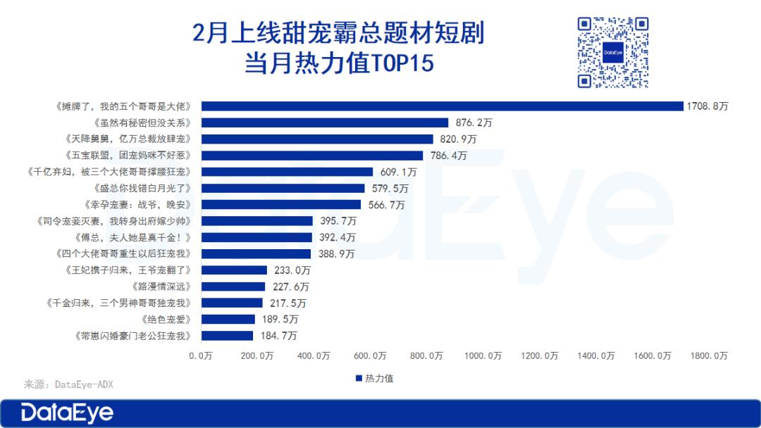 今年2月共上线35部霸总甜宠题材短剧,其中《摊牌了,我的五个哥哥是大佬》当月热力值超1700万。5月上线25部霸总甜宠短剧,其中5月21日上线的《闪婚成宠首富大佬爱上我》和5月初上线的《痴傻千金三叔宠我入骨》热力值均超1700万,《闪婚成宠首富大佬爱上我》至今累计热力值已经超3000万。