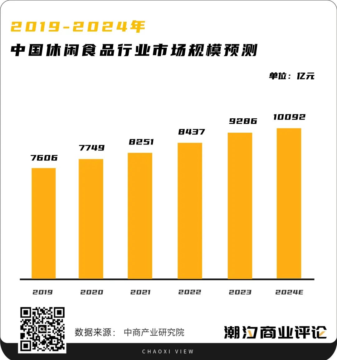 根据中商产业研究院最新数据,2023年我国休闲零食市场规模9286亿元,预计2024年市场规模超过万亿。