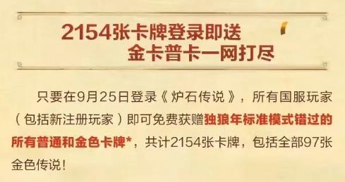 一、只要在9月25日登录《炉石传说》,所有国服玩家(包括新注册玩家)即可免费获赠独狼年标准模式错过的所有普通和金色卡牌,共计2154张卡牌,包括全部97张金色传说。