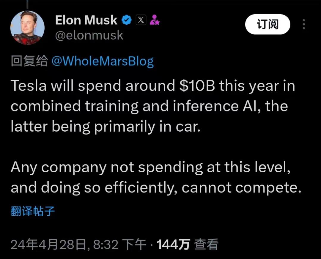 规模效应之外,凭借自我造血能力,马斯克还给这场端到端竞赛,划定了一个入场门槛。在4月份访华当天,马斯克发文称,“特斯拉今年将斥资约100亿美元用于AI的训练和推理,后者主要用于汽车。任何公司,如果没有达到这样的支出水平,并且不能高效地完成这项工作,就无法参与竞争。”