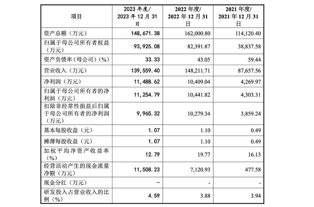 2020-2023年,鹰峰电子的整体营收分别约为4.82亿、8.77亿、14.82亿、13.96亿元;扣非归母净利润分别约为2464.50万、3859.24万、1.03亿、9965.32万元。