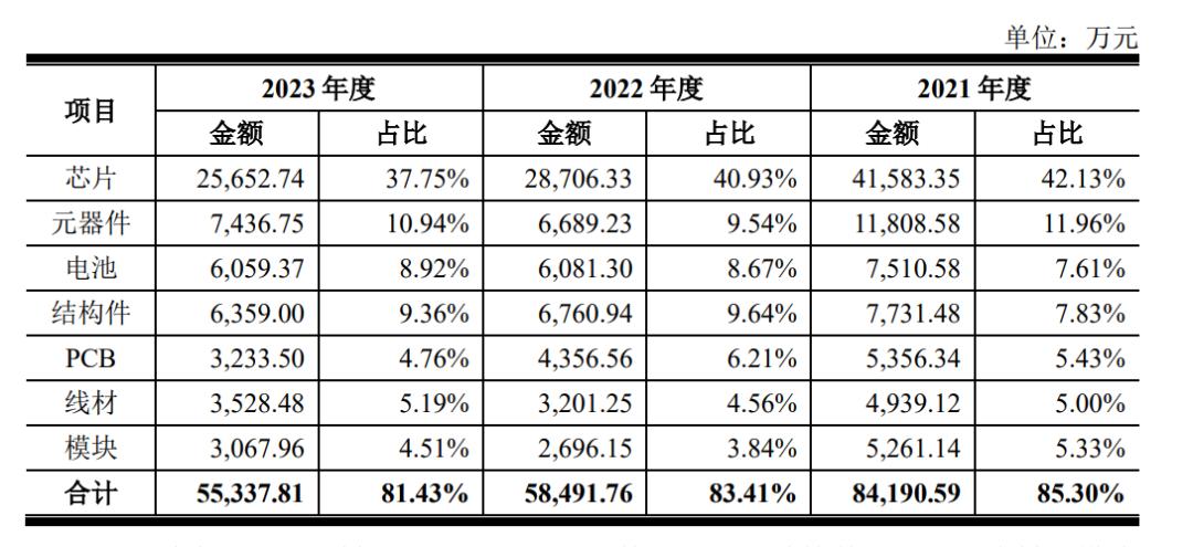 作为物联网领域专精特新企业,博实结的生产成本中,主要原材料包括芯片、元器件、电池、结构件、PCB、线材、模块,其中芯片的采购成本在40%左右,直接材料成本超过85%。