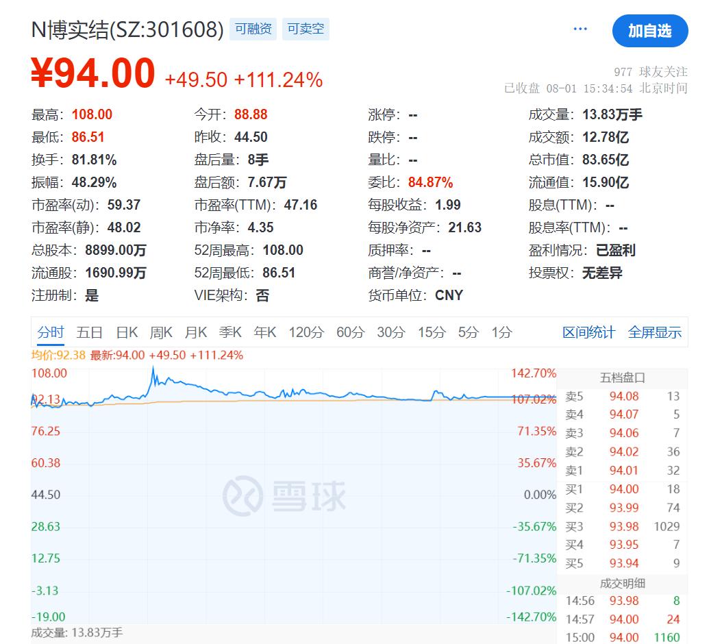 8月1日,物联网智能化硬件研发商博实结正式登陆深交所创业板。此次IPO,博实结发行2225.27万股,发行价为每股44.5元,募集资金总额9.90亿元。上市首日,博实结开盘大涨,截至收盘,博实结报94元/股,涨111.24%,市值达到83.65亿元。