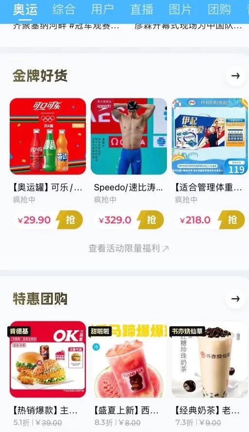 “体育+电商”方面,快手的做法是,在奥运界面附加相关的“金牌好货”“特惠团购”等活动入口。据悉,快手将通过预埋商品等方式,满足用户边看边买的一站式购物需求,目前,已经吸引近2800个商家加入。