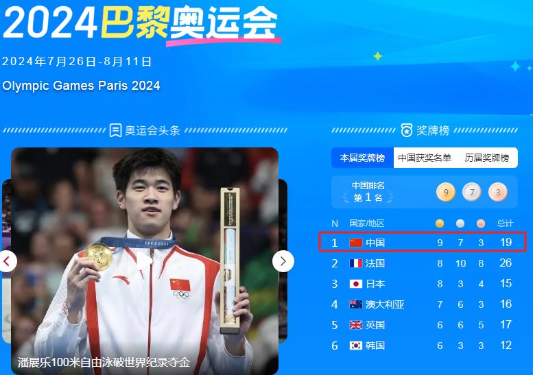 截至8月1日上午11时许,中国代表团以9金7银3铜共19枚奖牌,居金牌榜第一。图片来源:网页截图
