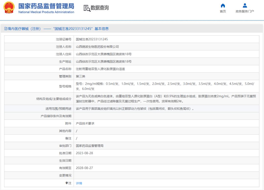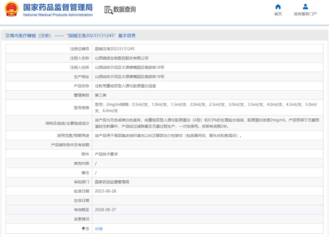 早在去年8月,国内胶原蛋白龙头企业锦波生物申报的“注射用重组Ⅲ型人源化胶原蛋白溶液”就已获药监局批准上市,注册证编号:国械注准20222233131245。据了解,该产品主要用于面部皱纹纠正,是国内唯一注射级别的重组胶原蛋白生物医用材料。