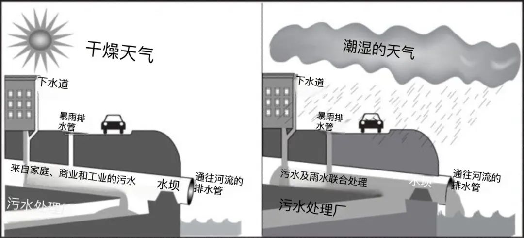 合流制排水系统的工作原理|图源:Wikipedia commons