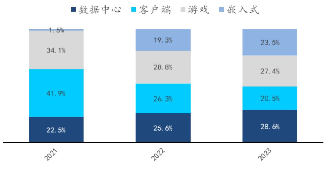 四条产品线中,客户端和游戏业务是AMD过去主要收入来源,一度超过85%,在2021年还占据总收入的75%。