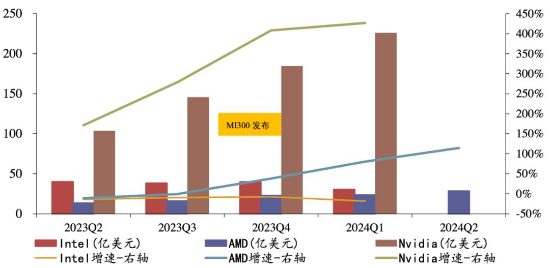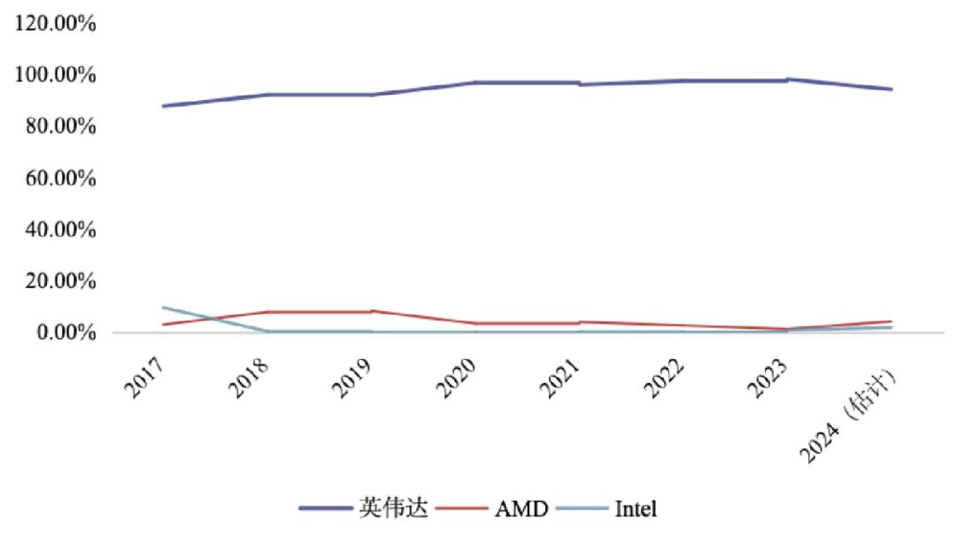 三大公司数据中心GPU市场份额占比。数据来源:财通证券