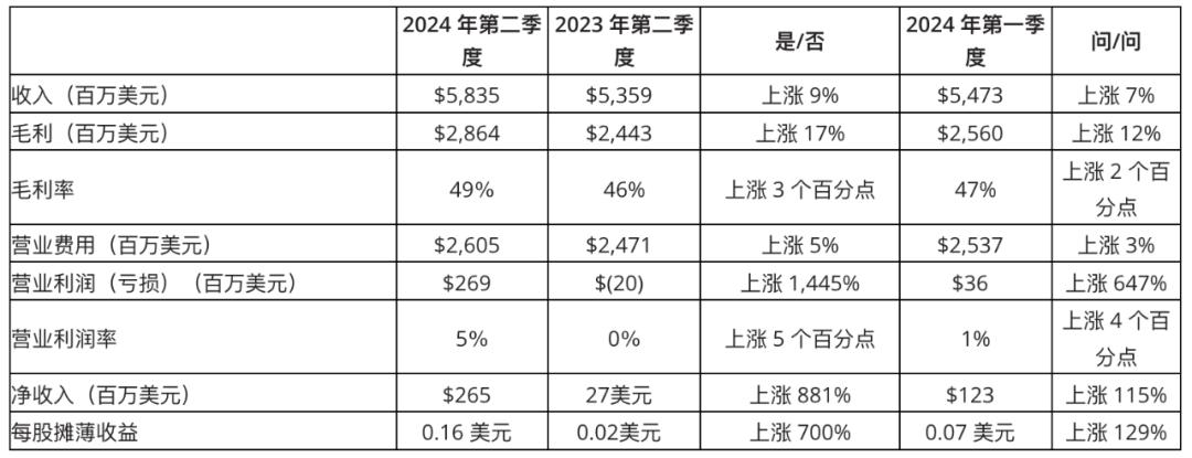 根据2024年第二季度财报显示,AMD营收为58.35亿美元,上年同期53.59亿美元,同比增长9%。