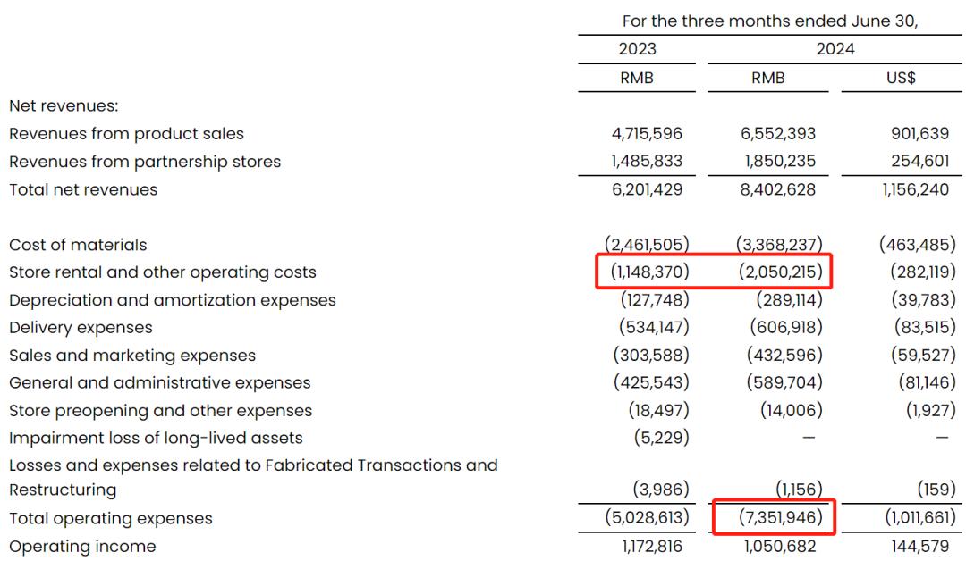 因此,二季度瑞幸的经营利润为 10.5 亿元,比去年同期还少了 1.2 亿元。经营利润率从去年同期的 18.9% 下降到 12.5% 。