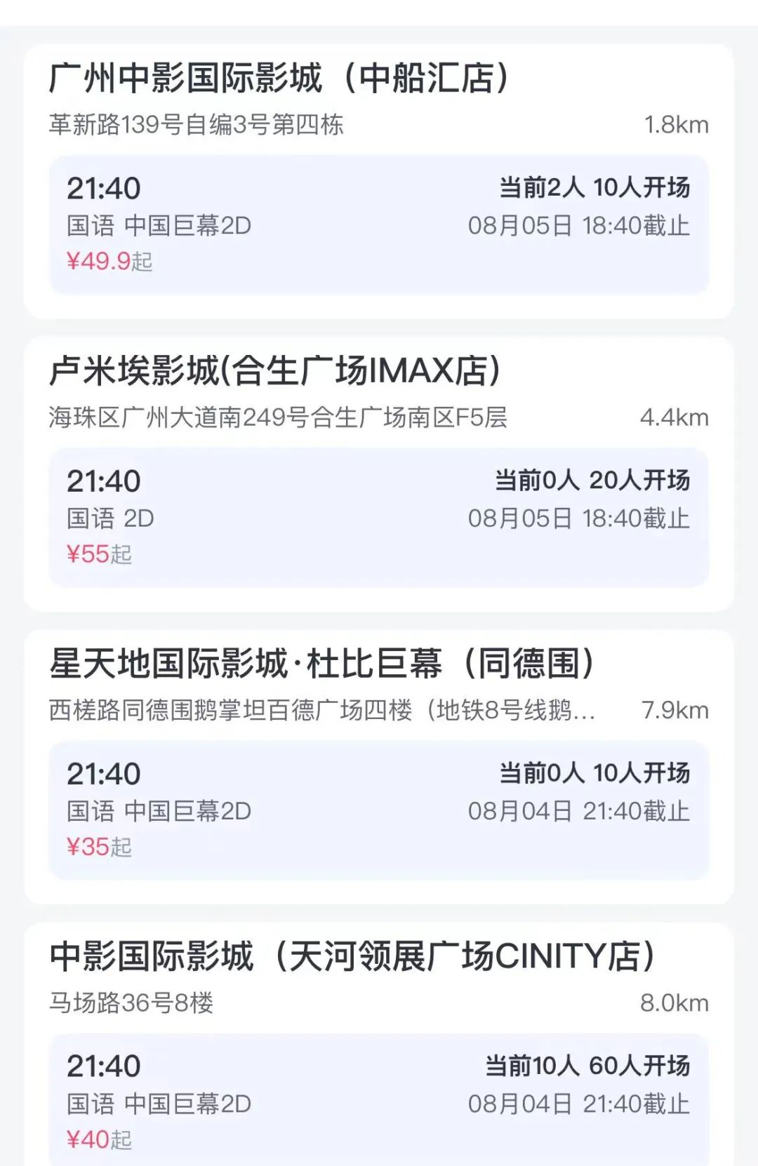 为了保证基本收入,参与放映的影院设定了成团人数,最少10人成团、最多90人成团。而截至发稿,广州5家可放映8月5日羽毛球男单决赛的影院均未达到能够开场的人数要求。