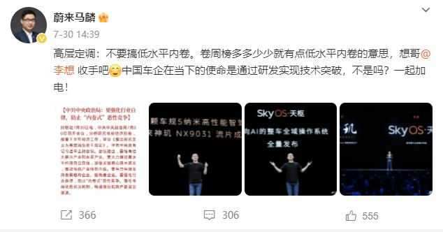 后有蔚来多位高管直接点名表达了对汽车销量周榜的抵制,如蔚来联合创始人、总裁秦力洪就称,“我们的品牌没有授权,凭什么用我们的品牌来发周榜,可不可以把我们品牌抠出去”;蔚来品牌与传播助理副总裁马麟还微博发文@理想汽车CEO李想表示,“高层定调,不要搞低水平内卷。卷周榜多多少少就有点低水平内卷的意思,想哥@李想收手吧。中国车企在当下的使命是通过研发实现技术突破,不是吗?一起加电!”