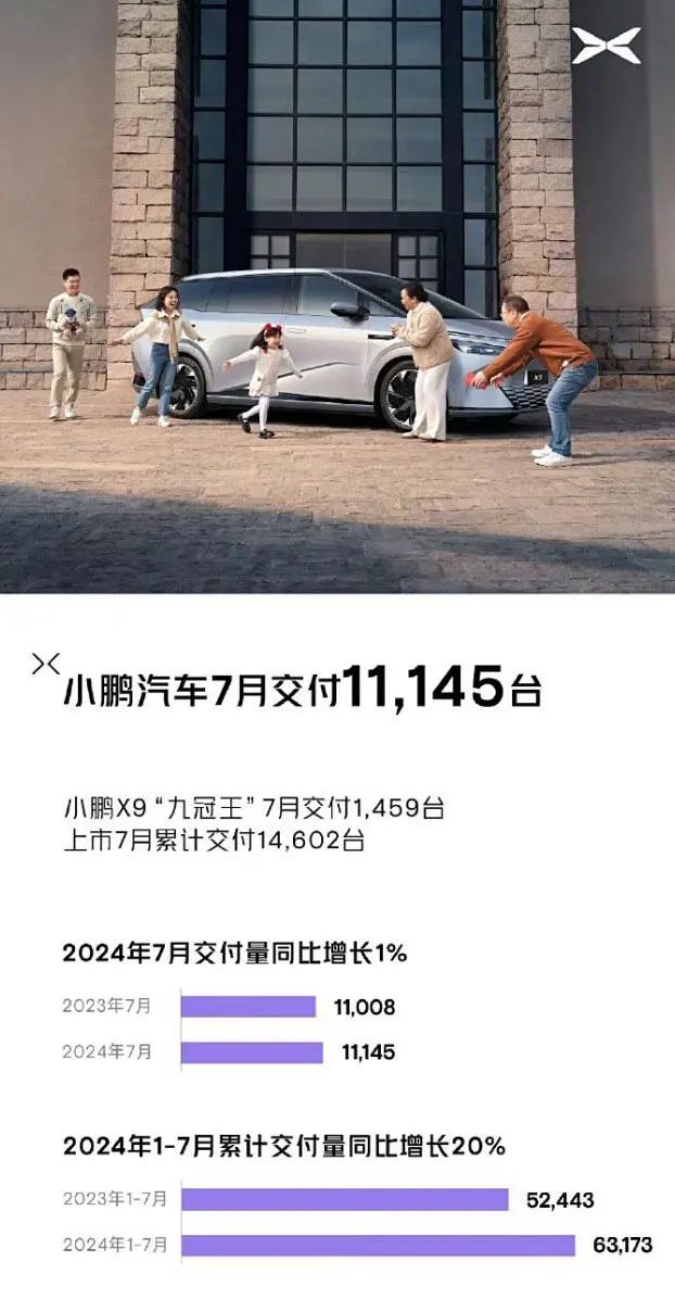 8月1日,小鹏汽车公布最新交付成绩。2024年7月,小鹏汽车共交付新车11,145台,同比增长1%,环比增长4%。2024年1月-7月,小鹏汽车累计交付新车共63,173台,同比增长20%。