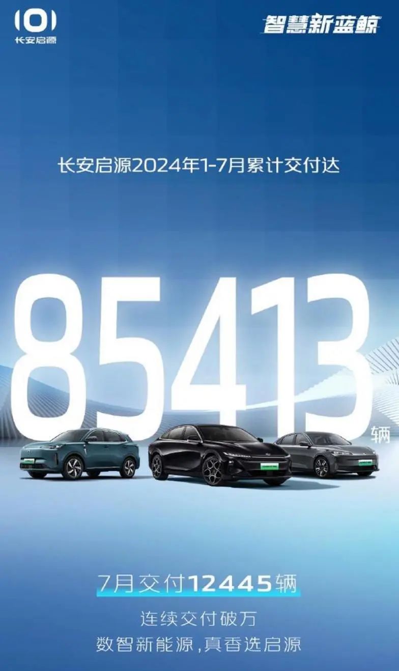 近日,长安启源公布了最新的交付数据,7 月交付 12445 辆,今年 1-7 月累计交付达 85413 辆,实现连续交付破万。