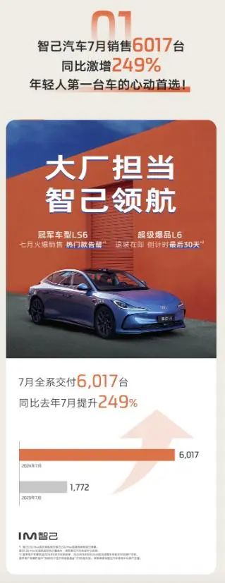 近日,智己汽车公布7月交付量6017台,同比增长249%,其中智己LS6、智己L6均有不错表现。