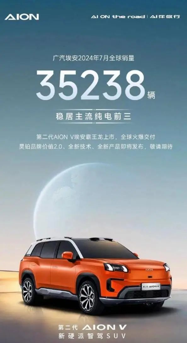 近日,广汽埃安公布的数据显示,7月全球销量为35238辆,环比增加0.6%,同比减少21.7%。
