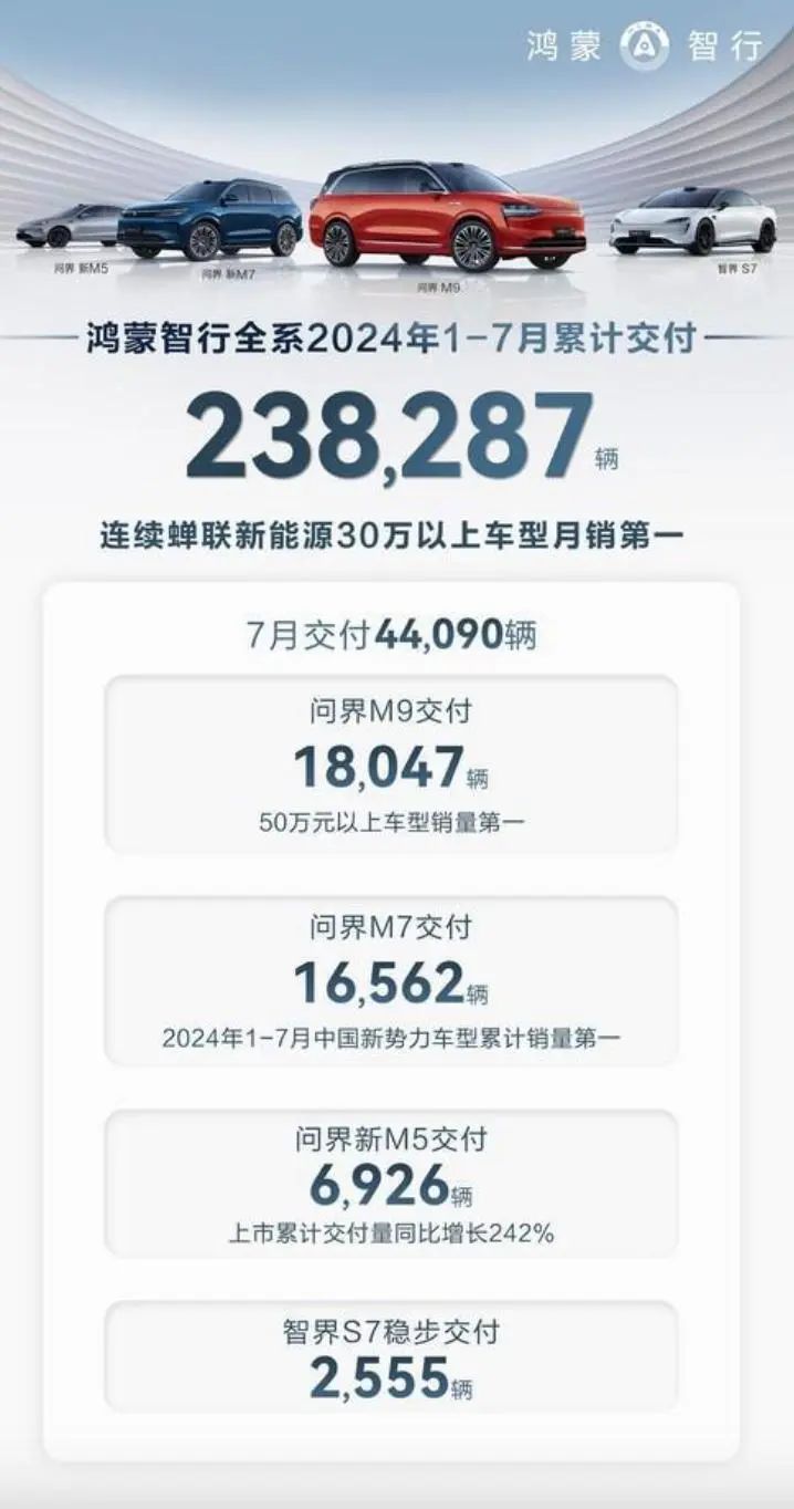 鸿蒙智行 7 月交付 44,090 辆,其中问界 M9 交付 18,047 辆,问界 M7 交付 16,562 辆,问界新 M5 交付 6,926 辆上市累计交付量同比增长 242%。