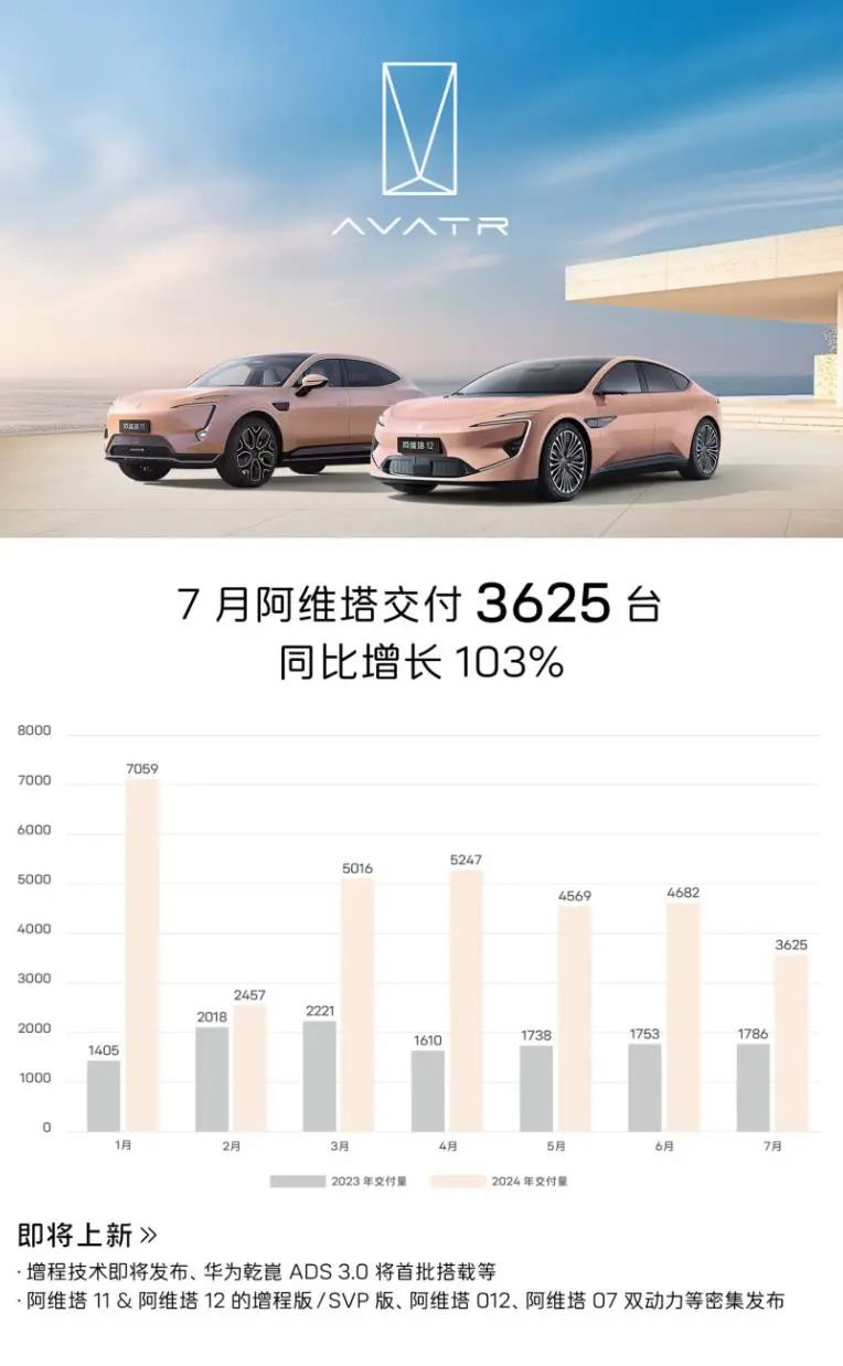 阿维塔汽车近日公布了最新交付数据,7 月交付 3625 台,同比增长 103%。