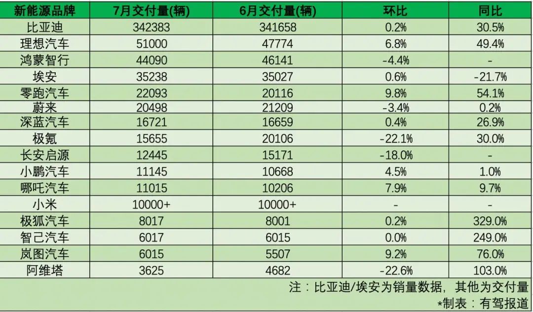 7月新能源交付量,理想破5万台!