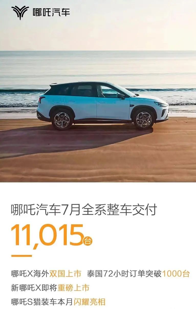 8月1日,哪吒汽车公布2024年7月交付数据,哪吒汽车7月全系共交付11015台。