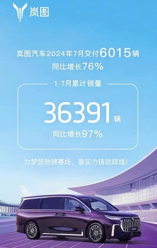 日前,岚图汽车发布了7月份的销量,7月岚图汽车交付6015辆,同比增长76%,1-7月累计交付36391辆,同比增长97%。