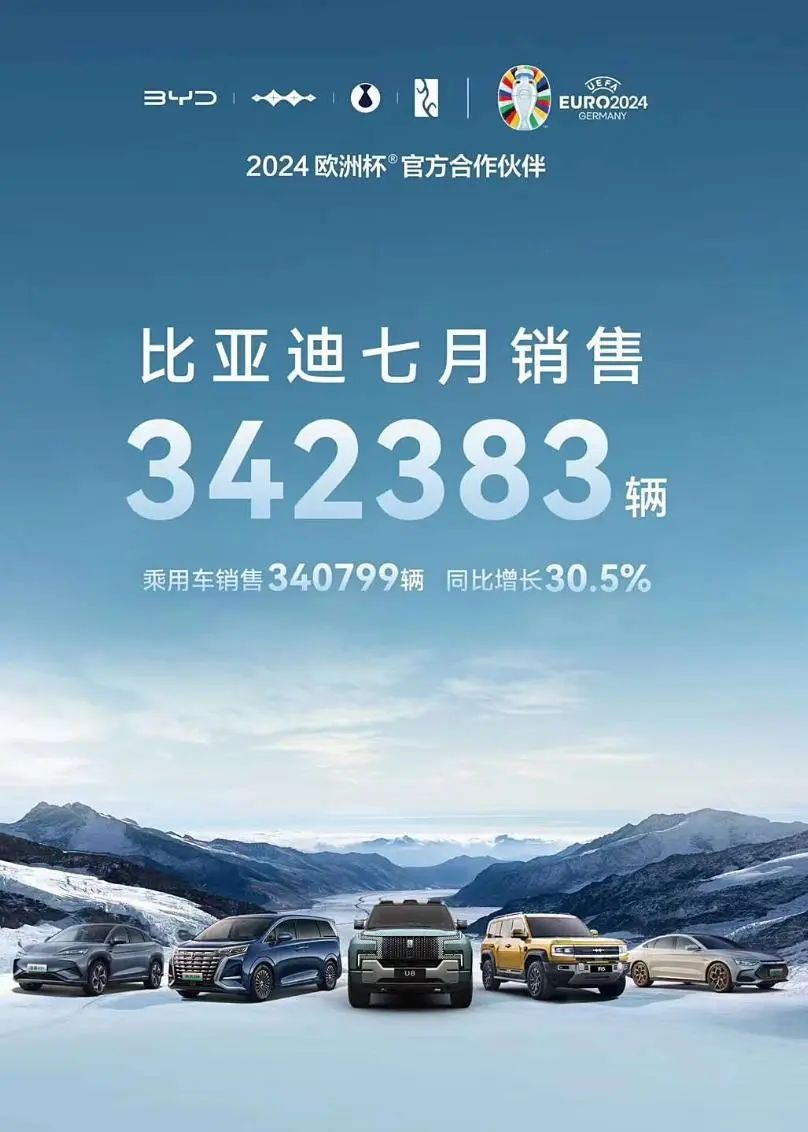 近日,比亚迪官方公布了7月销量为342383辆,其中乘用车销售340799辆,同比增长30.5%。