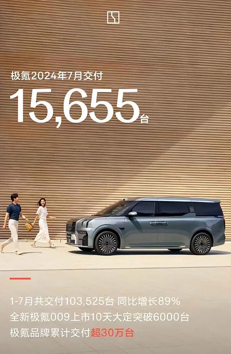 近日,我们从官方了解到,极氪7月交付15,655台,同比增长30%,1-7月共交付103,525台 同比增长89%,极氪品牌33个月累计交付突破300000台。