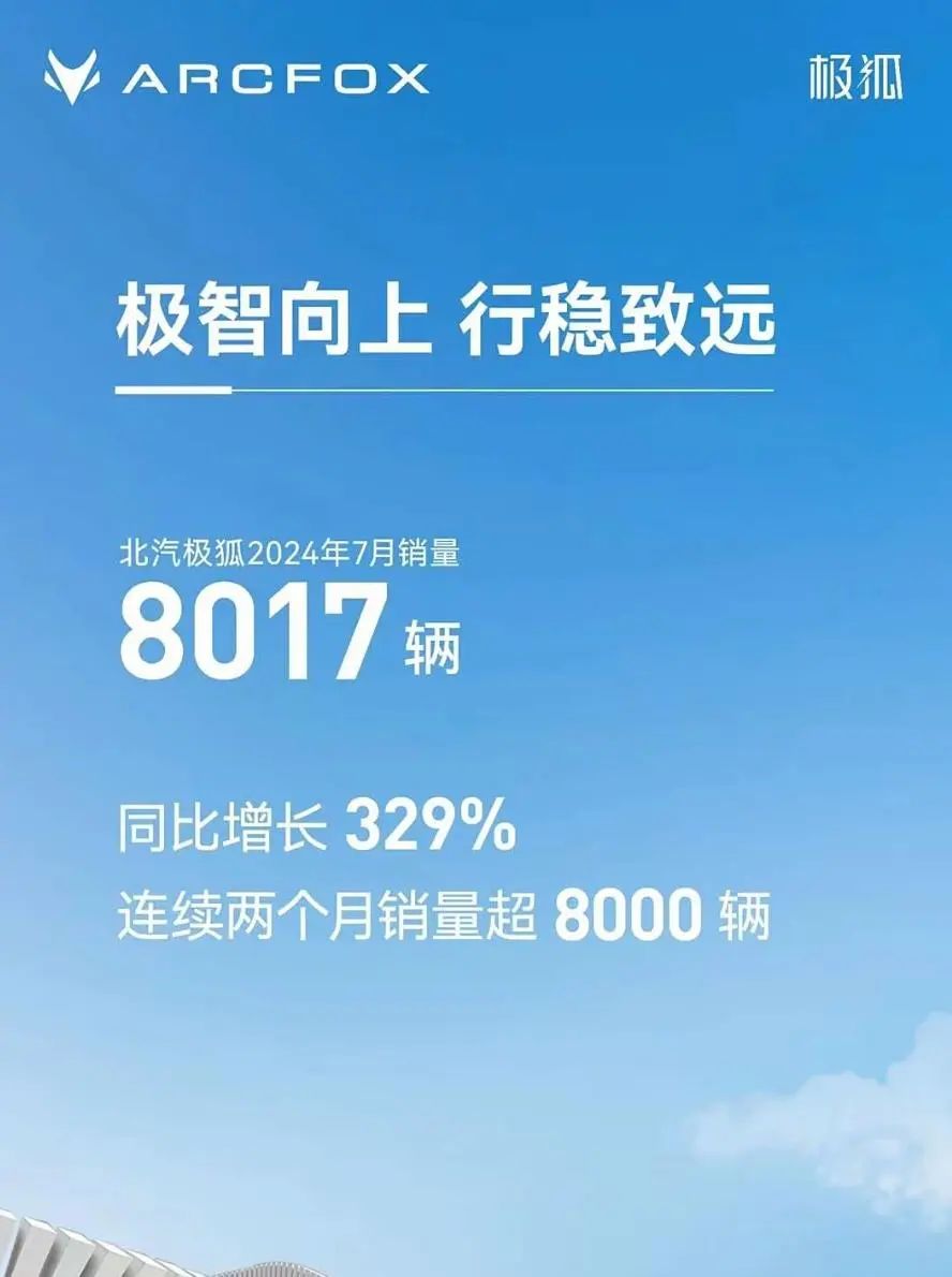 日前,极狐汽车公布了其2024年7月的销量为8017辆,同比增长329%,极狐品牌已经连续两个月销量超8000辆。