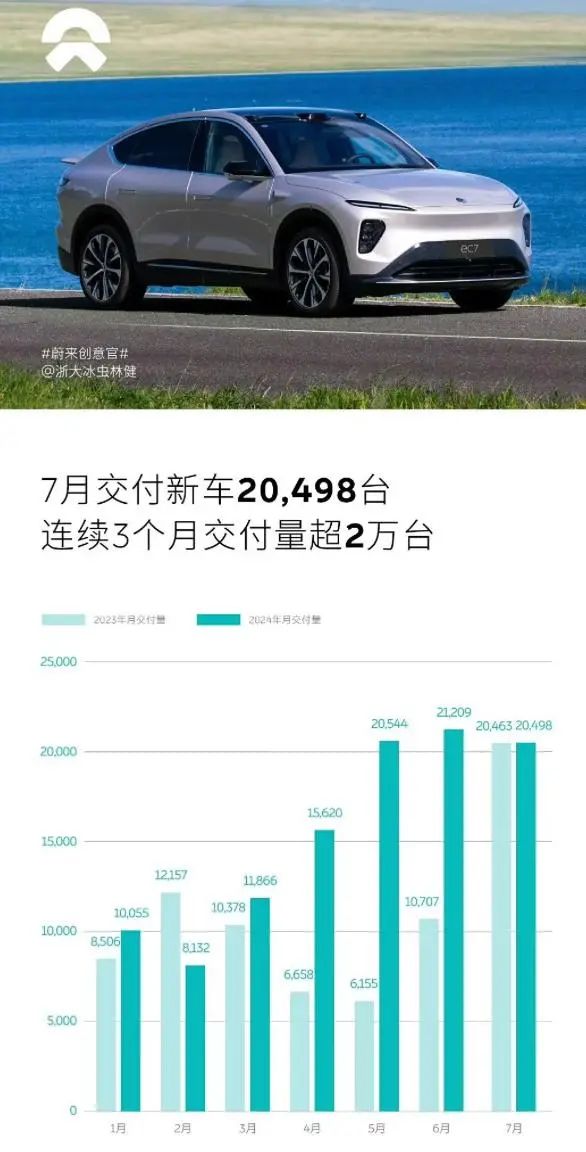 近日,蔚来公布7月交付数据,共计交付新车20498台,实现连续3个月交付量超2万台,同比增长0.17%。今年1-7月,蔚来共交付新车107924台,同比增长43.85%。截至目前,蔚来已累计交付新车557518台。
