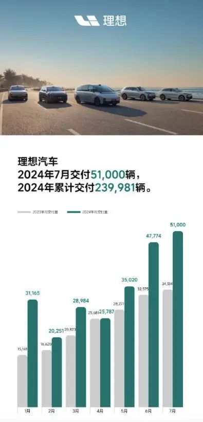 近日,理想汽车公布2024年7月交付数据。2024年7月,理想汽车交付新车51000辆,创月交付量的历史新高,同比增长49.4%。2024年1月至7月共计交付239981辆。截至2024年7月31日,理想汽车累计交付873345辆。
