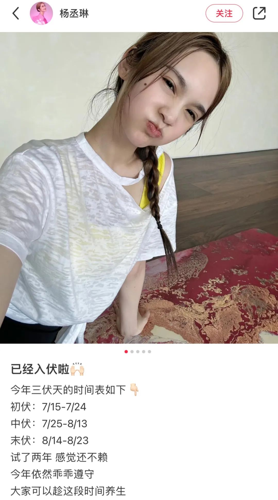 7月入伏后,“晒背”成为社交平台的爆火话题,其在抖音的累计播放数已超11亿,在小红书上也有超过9万条笔记。艺人杨丞琳听说了三伏天是预防和治疗疾病的好时机后,也在社交平台上连续三年分享自己不开空调、运动排汗的养生之道。