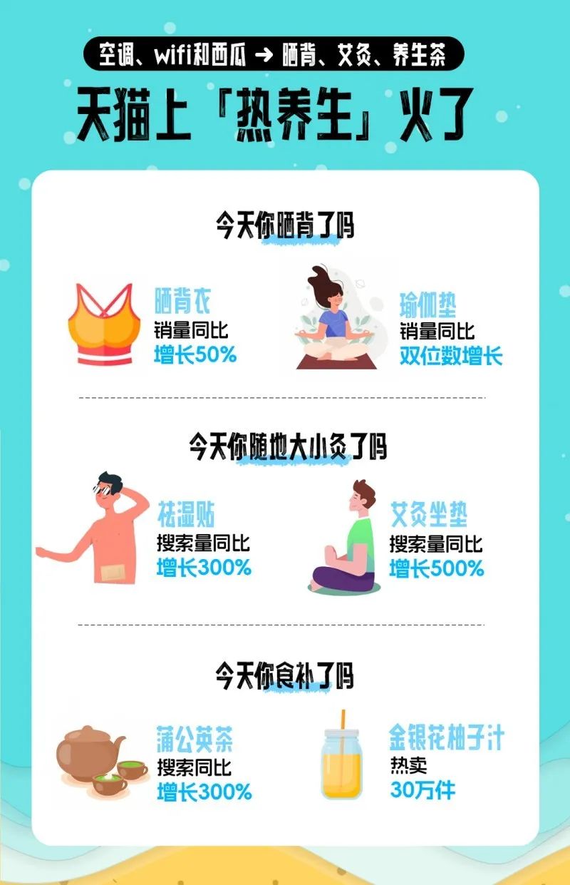 包括晒背在内的“热养生”产品也火了。据天猫数据,近一个月以来,晒背衣销量同比增长50%。艾灸坐垫和祛湿贴则分别增长了5倍和3倍。将食补刻入DNA的中国人,还把手上的冰美式换成蒲公英茶、金银花柚子汁等养生茶。