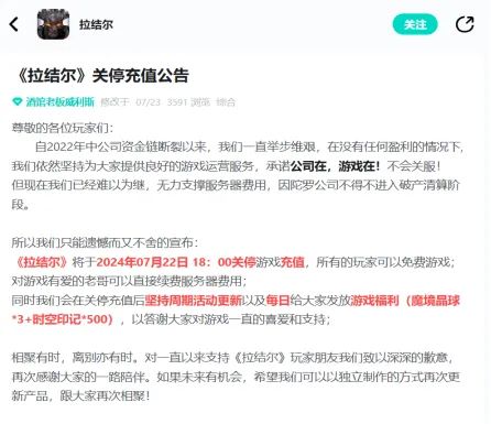 而在7月22日,广州因陀罗旗下两款游戏《环形战争》《拉结尔》在游戏社区TapTap官方账号上,分别发布了“关停充值公告”,称公司在2022年年中就资金链断裂,之后在没有任何盈利的情况下,坚持为玩家提供游戏运营服务,但现在已难以为继,无力支撑服务器费用,公司不得不进入破产清算阶段。
