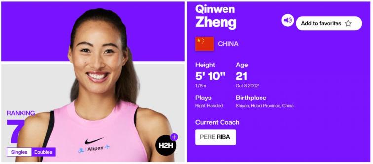 图片来源:WTA官网郑钦文的介绍