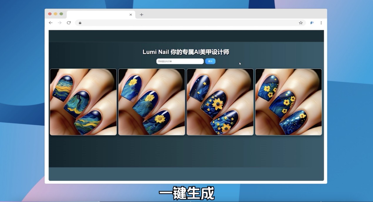 带着这样的目标,我们成功做了一个集创造和打分于一体的AI穿戴甲设计师demo出来,并将它命名为“LumiNail”。只要输入一个简单的词语,就能一键得到符合要求的穿戴甲设计图。