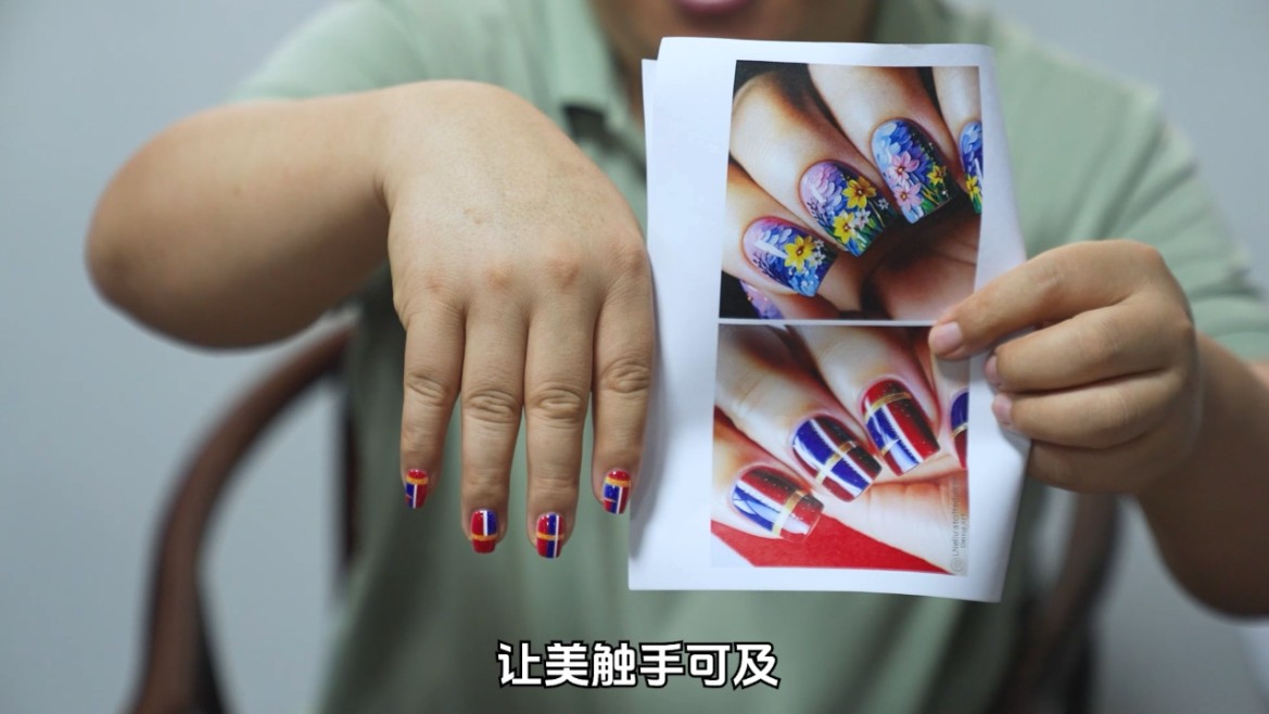 我们尝试了国旗、奥运、艺术作品和中国风等多个主题,产出了大量美甲图,并把AI评分靠前的几张设计图给到了土哥。土哥对我们的初步尝试成果大加赞赏,并立马就把其中一款打印出了实物,戴到了手上。