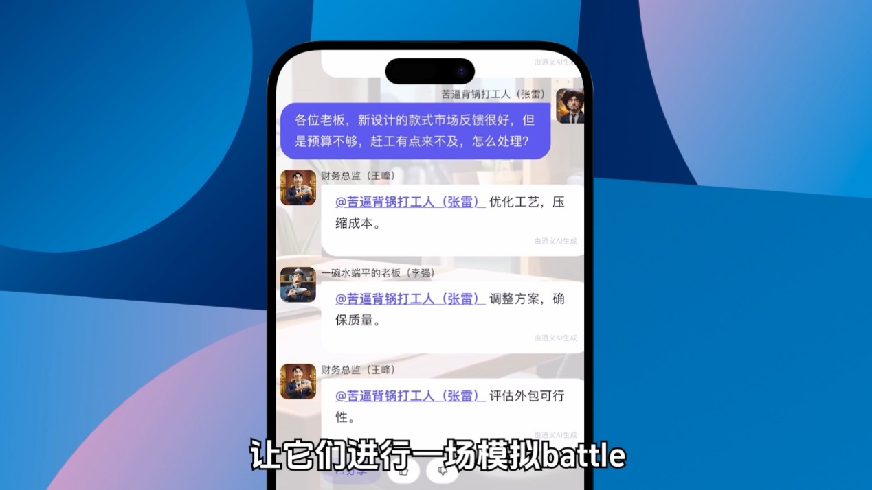 还是拿奥运主题穿戴甲方案为例,可以把各个员工的身份以及他们关注的侧重点输入给AI,例如死抠预算的财务、天马行空的创意总监、负责把关产品的挑剔老板娘、负责落地执行的苦逼打工人等等,让它们进行一场模拟battle,帮助老板提前预判各方的立场。如果老板想和其中一方互动,还可以把这些AI员工的智能体拉到一个群聊里,让他们针对某个问题开展讨论。