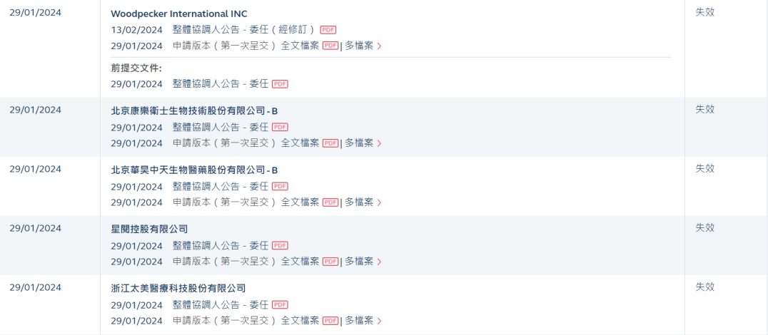 36氪重庆获悉,7月29日,据港交所信息显示,于2024年1月29日在港交所首次提交上市申请的啄木鸟家庭维修,目前处于“失效”状态,此外,与啄木鸟家庭维修同天递表的康乐卫士、华昊中天、星阅控股、太美医疗均处于“失效”状态。对此,市场相关人士表示,招股书失效系港股IPO正常机制,一般不会影响公司IPO进程。