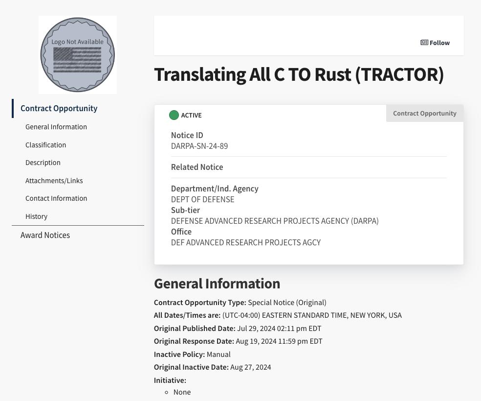 近日,有不少人发现,美国国防高级研究计划局(DARPA)正在启动一项资助计划,即推动一款程序代码转换工具 TRACTOR(全称为 Translating All C to Rust)的开发,旨在借助 AI 大模型技术独立地将传统的 C 和 C++ 代码直接转换为可用的 Rust 代码。