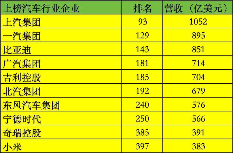 具体来看,此次进入《财富》世界500强排行榜的中国汽车及零部件企业依次为上汽集团、一汽集团、比亚迪、广汽集团、吉利控股、北汽集团、东风汽车集团、宁德时代、奇瑞控股以及小米。
