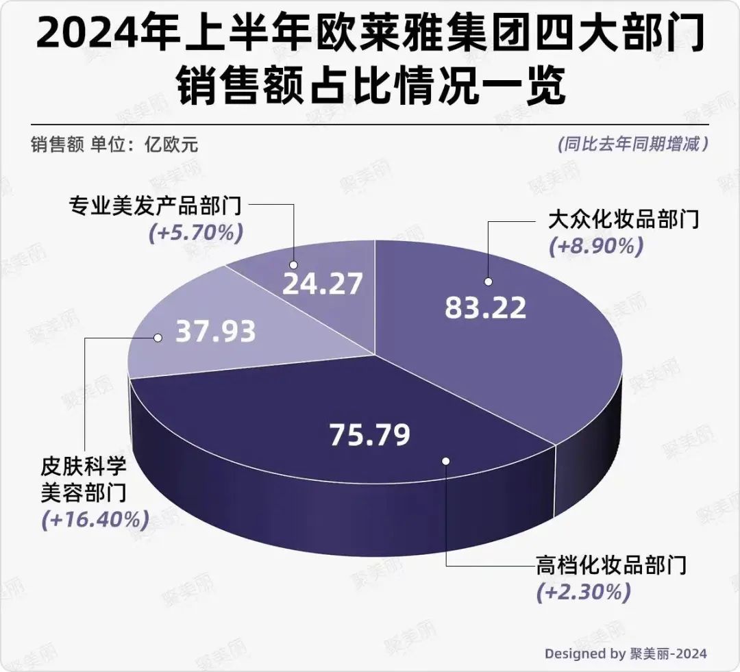 从最新财报数据来看,欧莱雅集团皮肤科学美容部门作为四大部门中的最高增速部门,也是唯一双位数增长的部门,皮肤科学美容部门今年上半年同比增长16.4%,销售额为37.93亿欧元(约合人民币297.49亿元)。