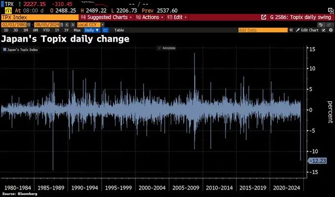 纵观近期的全球市场,人们在过去几个交易日不难发现的一个现象是,日股可谓是眼下全球市场中跌幅最为凄惨的——日经225指数周一收盘重挫12.4%,报31506点,已抹去今年以来所有涨幅。这是日经225指数史上最大下跌点数,超越1987年10月黑色星期一的纪录。