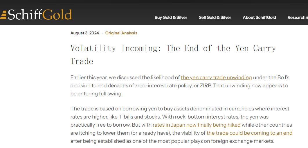 欧洲太平洋资产管理公司首席市场策略师彼得·希夫(Peter Schiff)在上周末也撰文表示,现在投资者能否几乎免费借贷的机会已经结束,他们开始了结围绕日元的套利交易,这导致了外汇和其他市场的波动加剧。