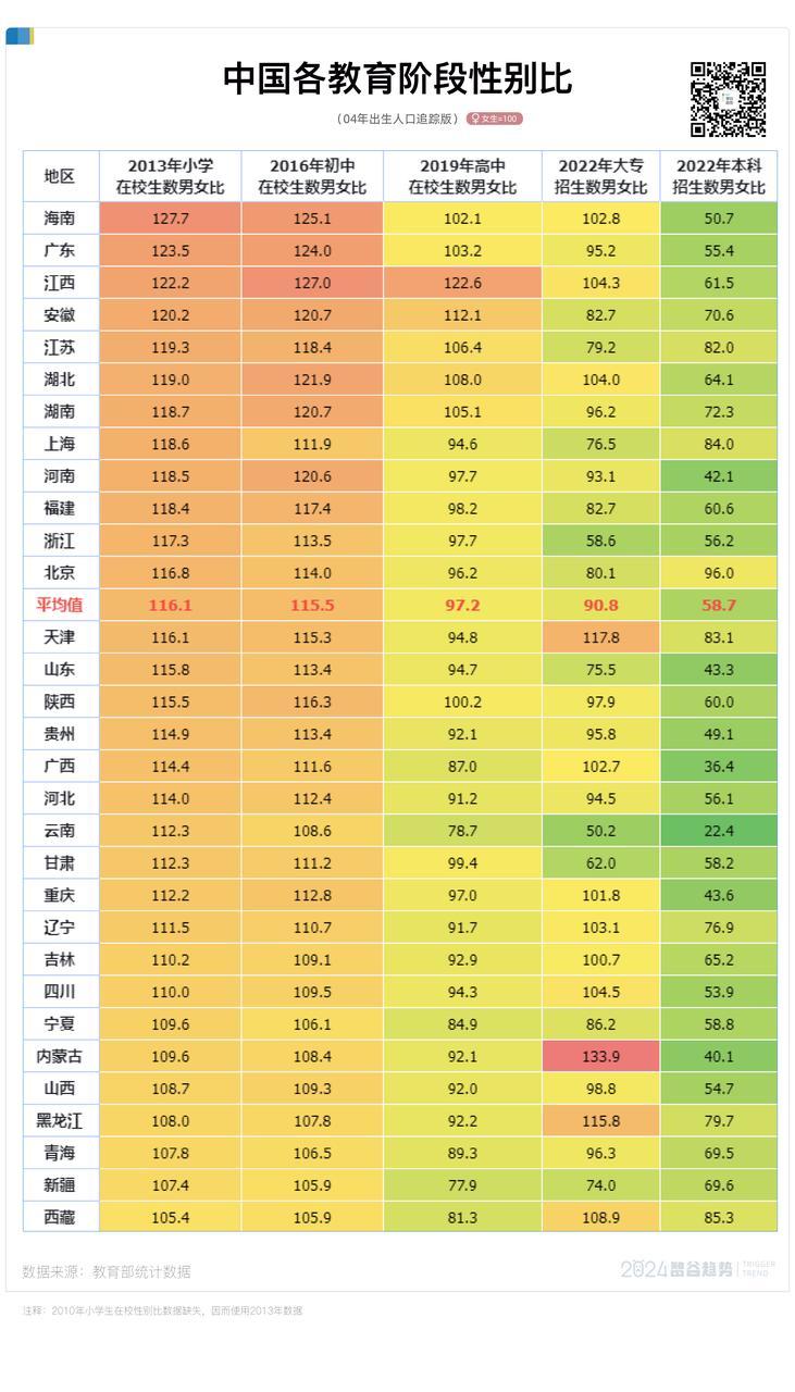 例如江西,2004年出生的这一代人,初中男生比女生多出27%,但到本科招生,女生就已经比男生多出将近四成。