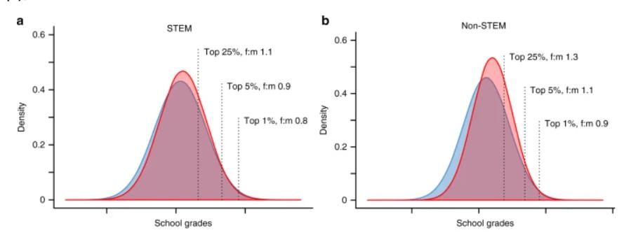 一篇2018年发在nature上的论文《Gender differences in individual variation in academic grades fail to fit expected patterns for STEM》,在搜集完164万个样本后,发现女性平均成绩均好于男性,总体而言方差更小,集中度更高。