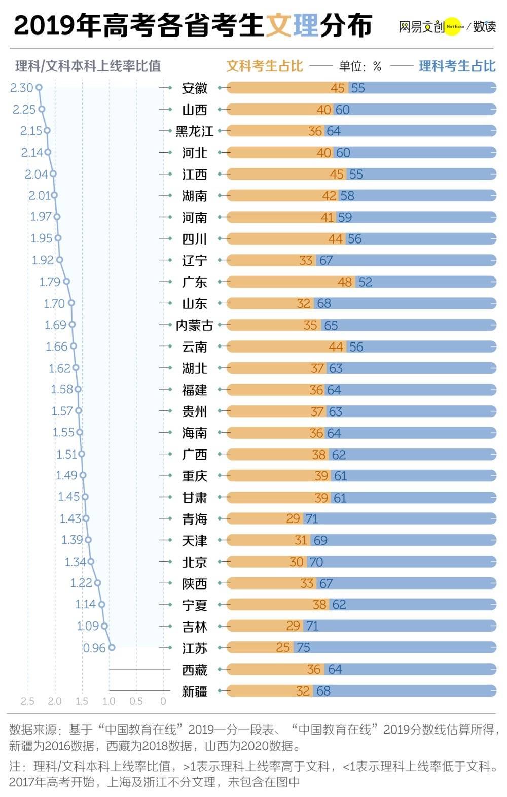@网易数读在2020年做了一次系统梳理,发现全国31省市均存在“理科考生数量以压倒性优势超过文科考生”的情况。