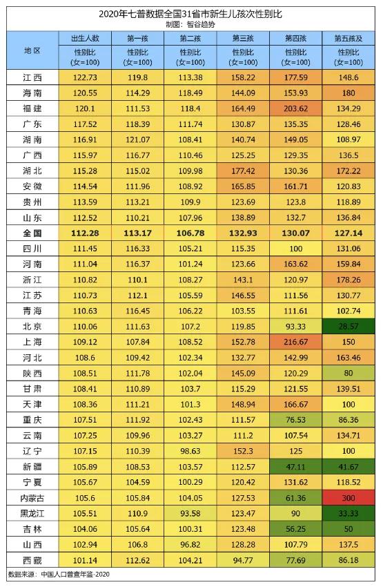 这几年的幼儿园小朋友,大多是19-20年左右出生,所以当我们翻看全国各地区七普(2020年数据)的新生儿孩次性别比数据时,就会发现: